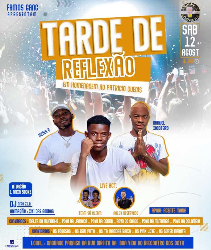 - Vou organizar um evento no dia 2023-08-12 com o tema Tarde de Reflexão - Em homenagem ao Patrício Guedes no/a Rua direita da Boa Vida, Paraíso, Cacuaco clica no link para saber mais.