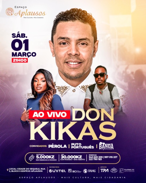 - Vou organizar um evento no dia 2025-03-01 com o tema Ao Vivo Don Kikas no/a Espaço Aplausos, Rua 3, Bloco 5, Sequele clica no link para saber mais.