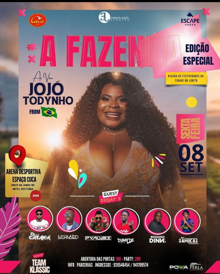 - Vou organizar um evento no dia 2023-09-08 com o tema A Fazenda Com JoJo Todynho no/a Espaço Cuca, Lobito clica no link para saber mais.